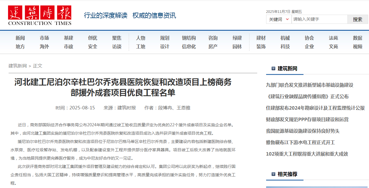 河北建工尼泊尔辛杜巴尔乔克县医院恢复和改造项目上榜商务部援外成套项目优良工程名单 时间:2025-08-15来源:建筑时报作者:段博冉、王恩雅 近日,商务部国际经济合作事务局公布2024年期间通过竣工验收且质量评定为优良的2...
