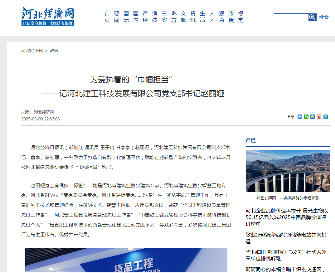 为爱执着的“巾帼担当” ----记河北建工科技发展有限公司党支部书记赵丽娅 赵丽娅,河北建工科技发展有限公司党支部书记、董事、总经理,一名致力于打造自有数字化管理平台,赋能企业转型升级的实践者,2025年3月被河北省建筑业协会授予...