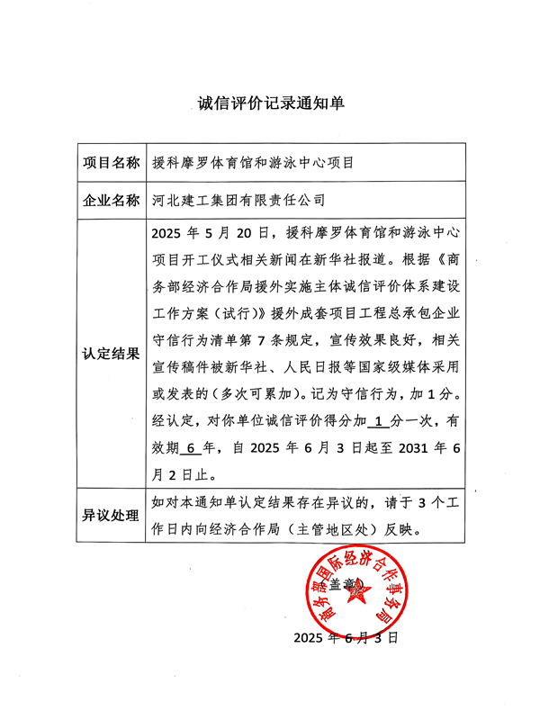 52AV 喜获商务部诚信评价嘉奖 近日,52AV 收到商务部国际经济合作事务局《诚信评价记录通知单》。集团公司因援科摩罗体育馆和游泳中心项目开工仪式宣传效果良好,宣传稿件被新华社、人民日报等国家级媒体采用或发表的守信行为,喜获诚信评...